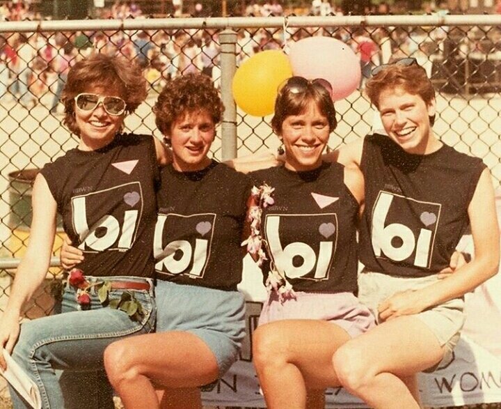 I have a t-shirt that I bought about four years ago from Autostraddle, it’s a recreation of a shirt worn by Boston Bisexual Women’s Network at the Christopher Street Liberation Day, New York City in1983, and it proclaims on the front in a gorgeous vintage looking logo ‘bi’.